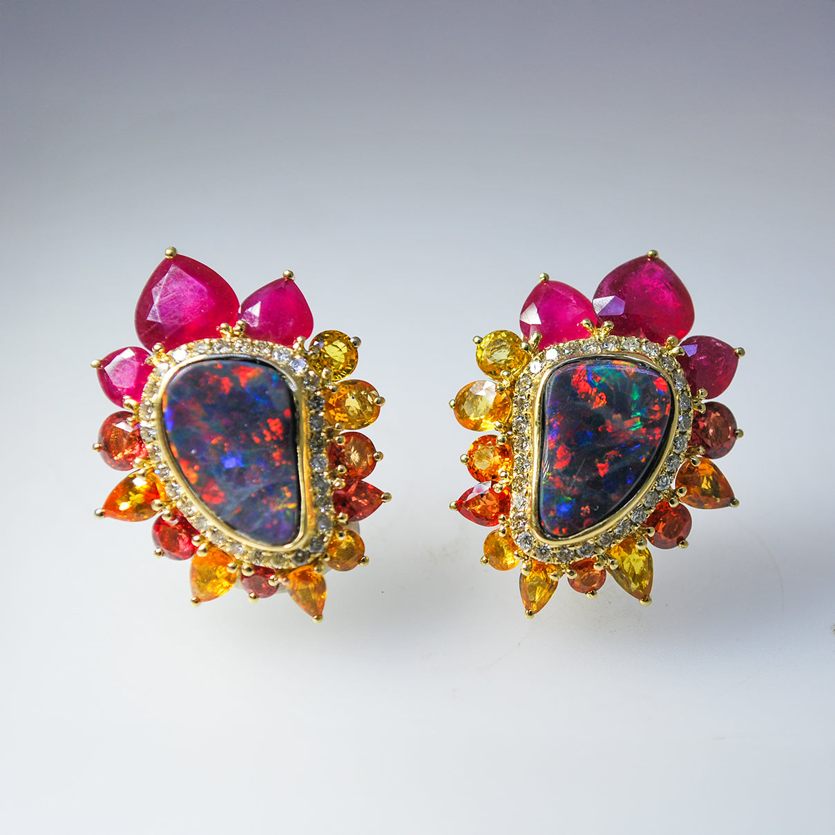 A client approached us with two striking black opals, hoping to create a meaningful birthday gift for a friend. With full creative freedom, we designed a pair of earrings that placed the opals at the centre, framed by rubies, fancy sapphires, and diamonds set in 18K yellow gold.