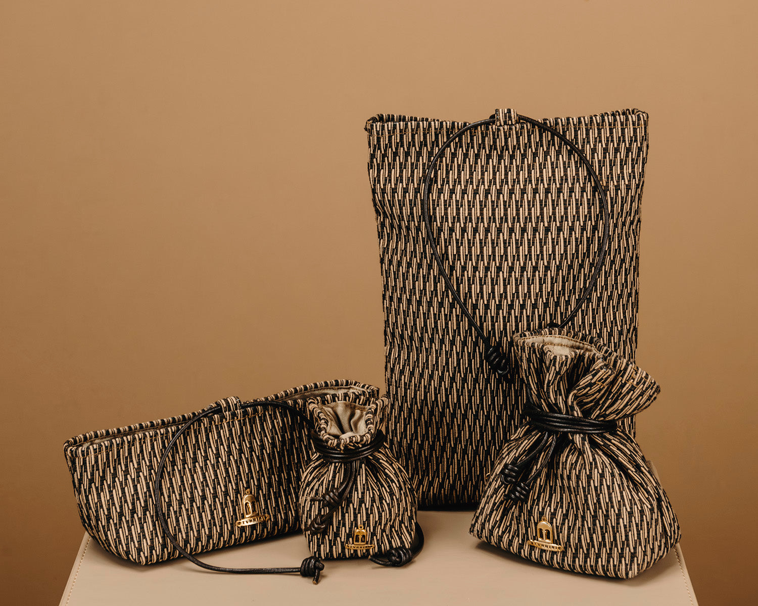We use silk-blend textiles to create each pouch with a richly textured design on the exterior and soft woven silk for the protective interior.
